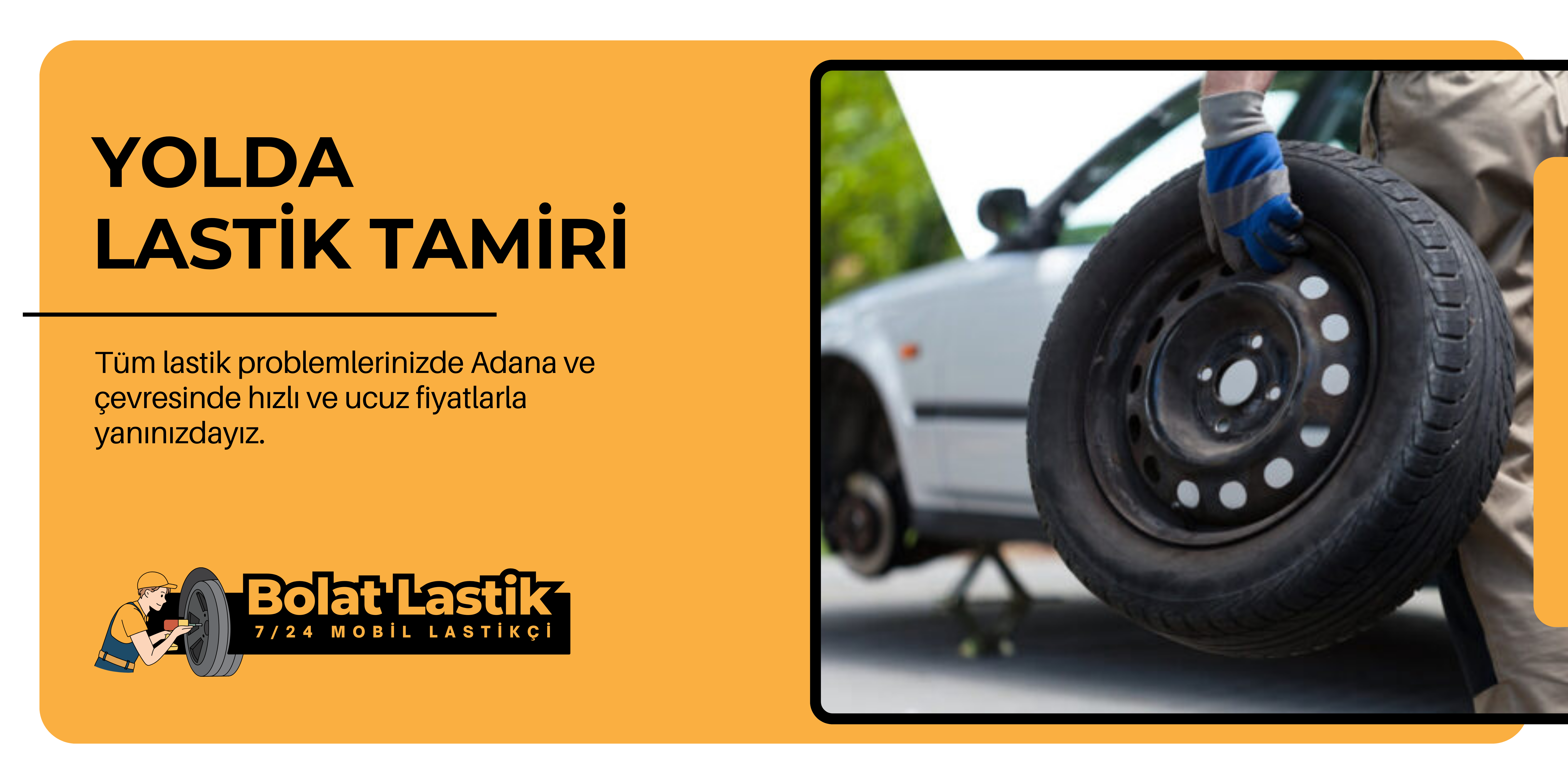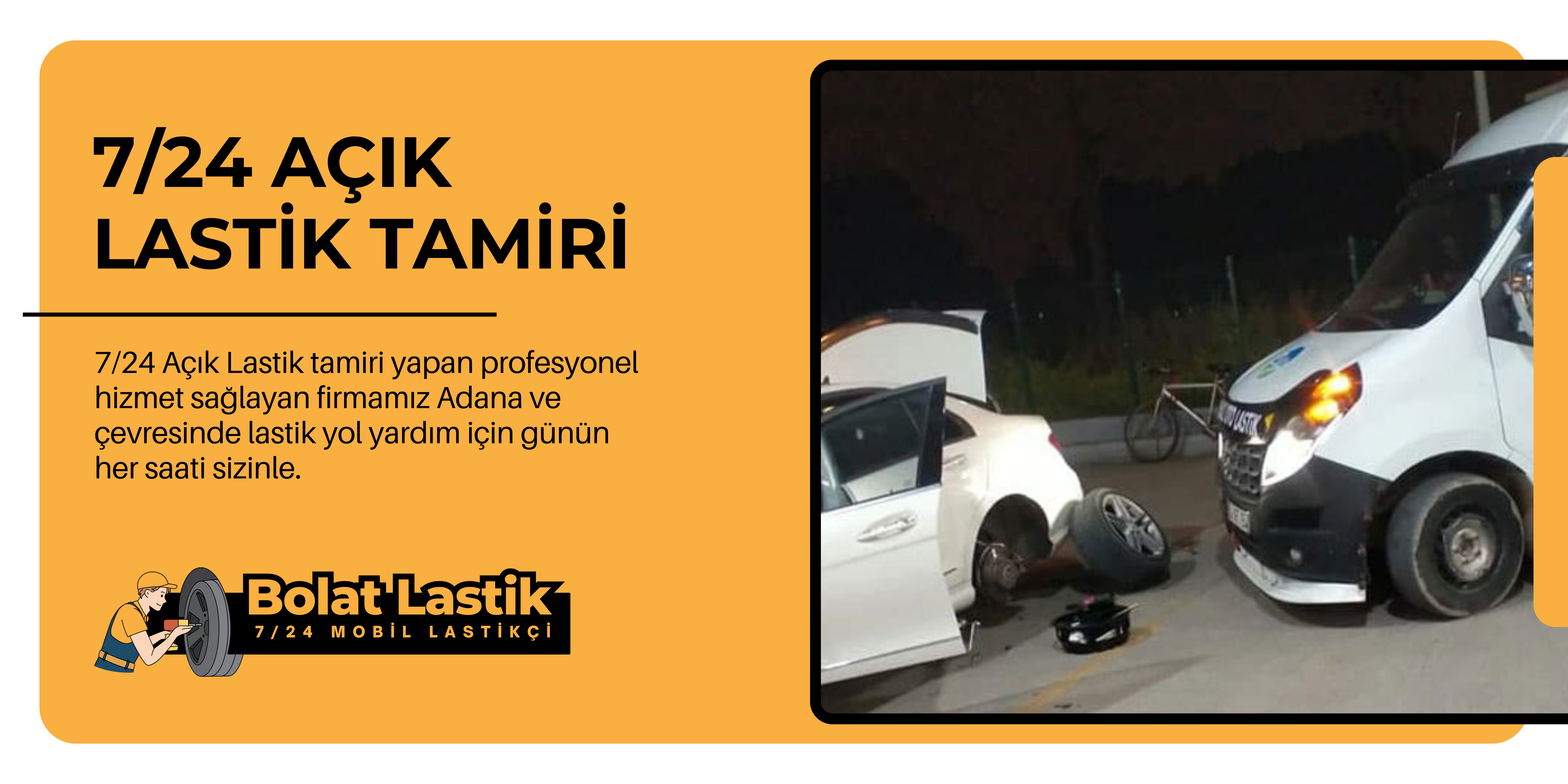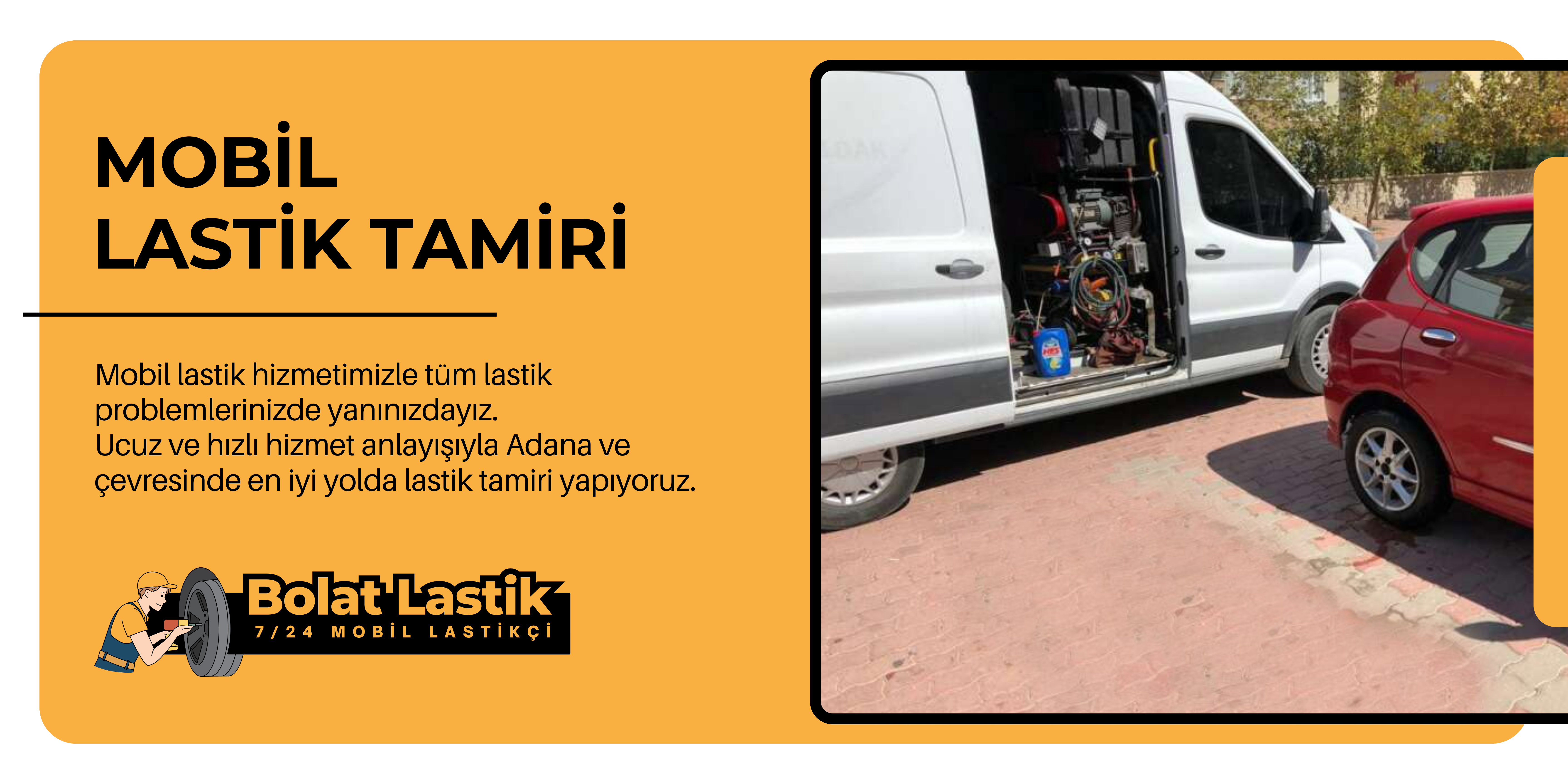Bolat Oto Lastik Tamir olarak Mobil lastik aracamız ile tüm lastik problemlerinizde yanınızdayız. Ucuz ve hızlı hizmet anlayışıyla Adana ve çevresinde en iyi yolda lastik tamiri yapıyoruz.  7/24 Açık Lastik tamiri yapan profesyonel hizmet sağlayan firmamız Adana’da lastik yol yardımı için günün her saatinde hizmetinizdedir.